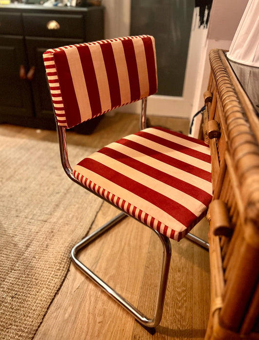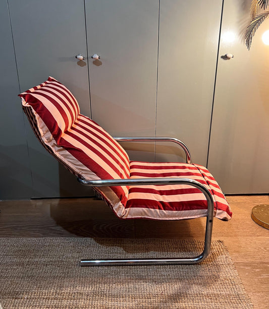 Vintage c1970s chrome armchair newly reupholstered in Colours Of Arly Striped velvet in maroon and Alderley Edge