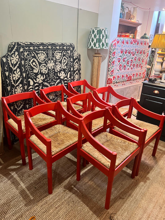 8 Vico Magistretti c1960s Carimate chairs professionally refurbished in classic RAL 3000 RED with rush seats - price is per chair