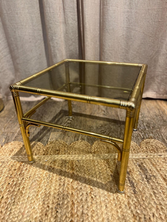 Hollywood Regency style faux bamboo brass side table with smoky glass top