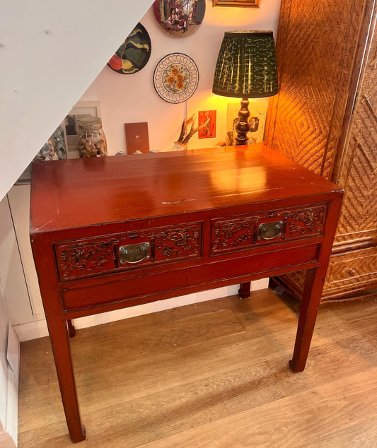 Stunning vintage oriental burnt orange lacquered console table with two drawers