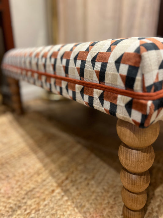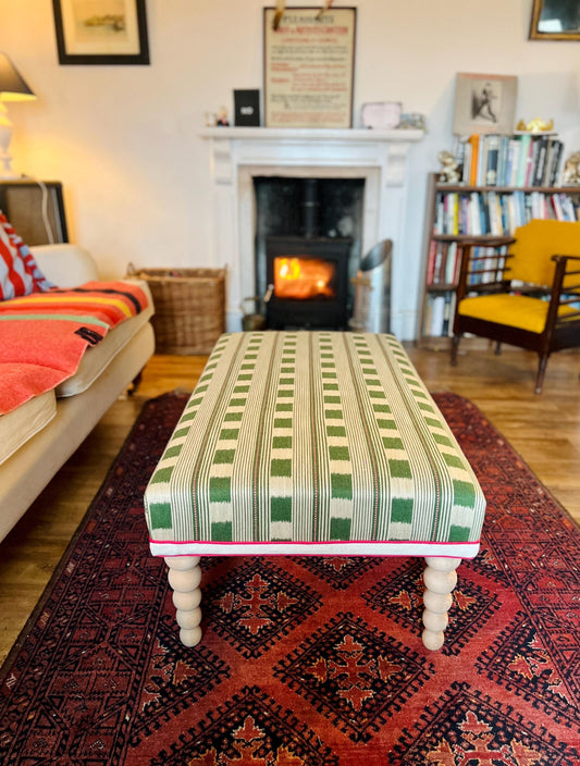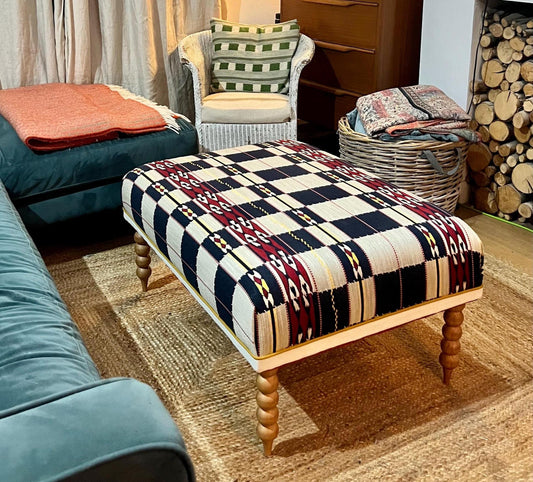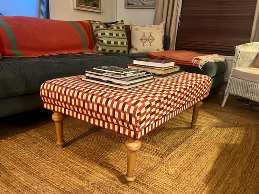 Bespoke Footstool / Ottoman in customers own fabric, custom sizes available and a choice of turned wooden legs